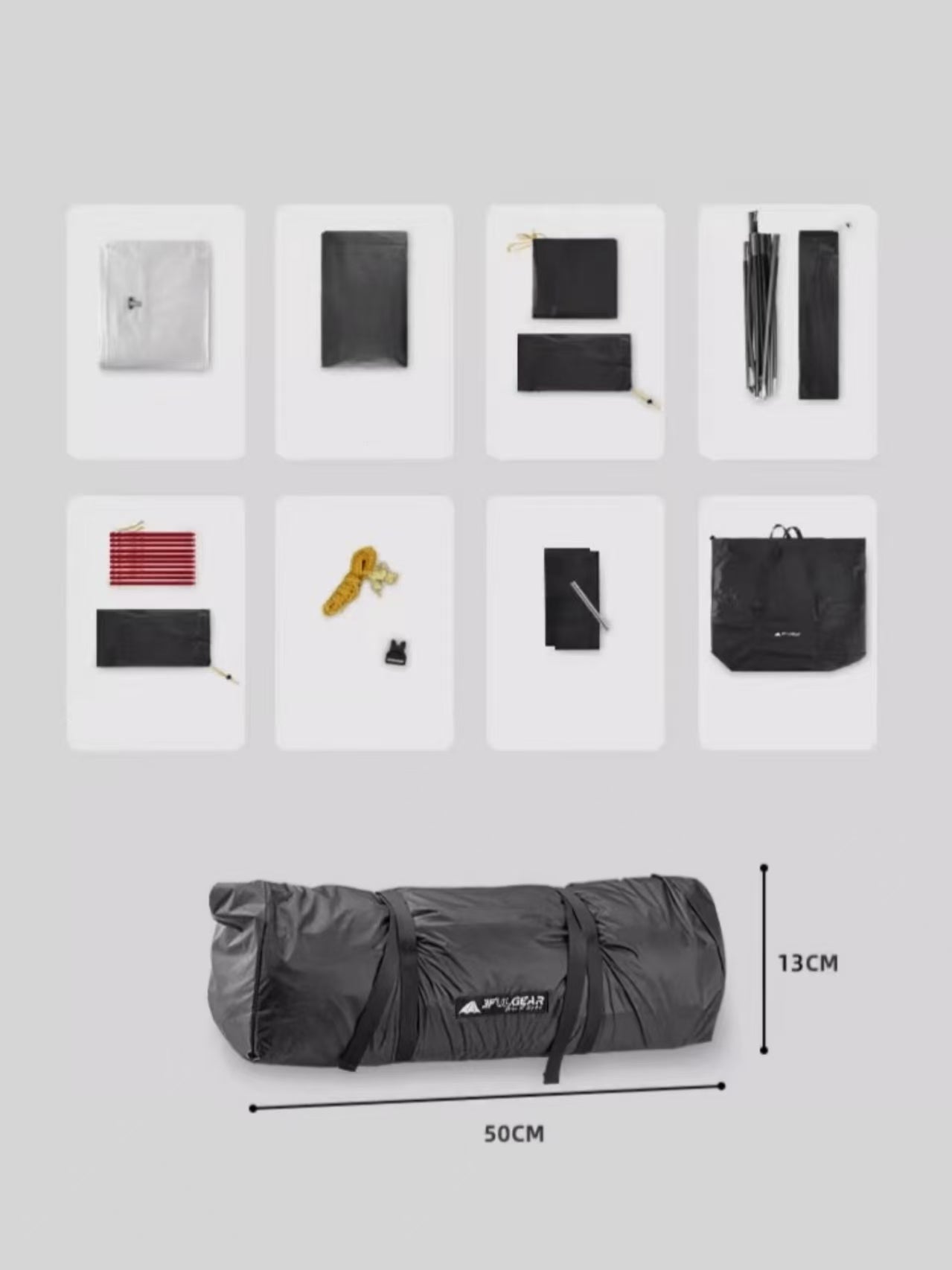 | Accessories | Outer Tent*1 + Inner Tent*1 + 2mm Reflective Wind Rope *4 + Ground Nail*9 + Hot Fit Patch *2 / Ground Nail Storage Bag |