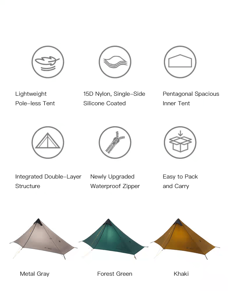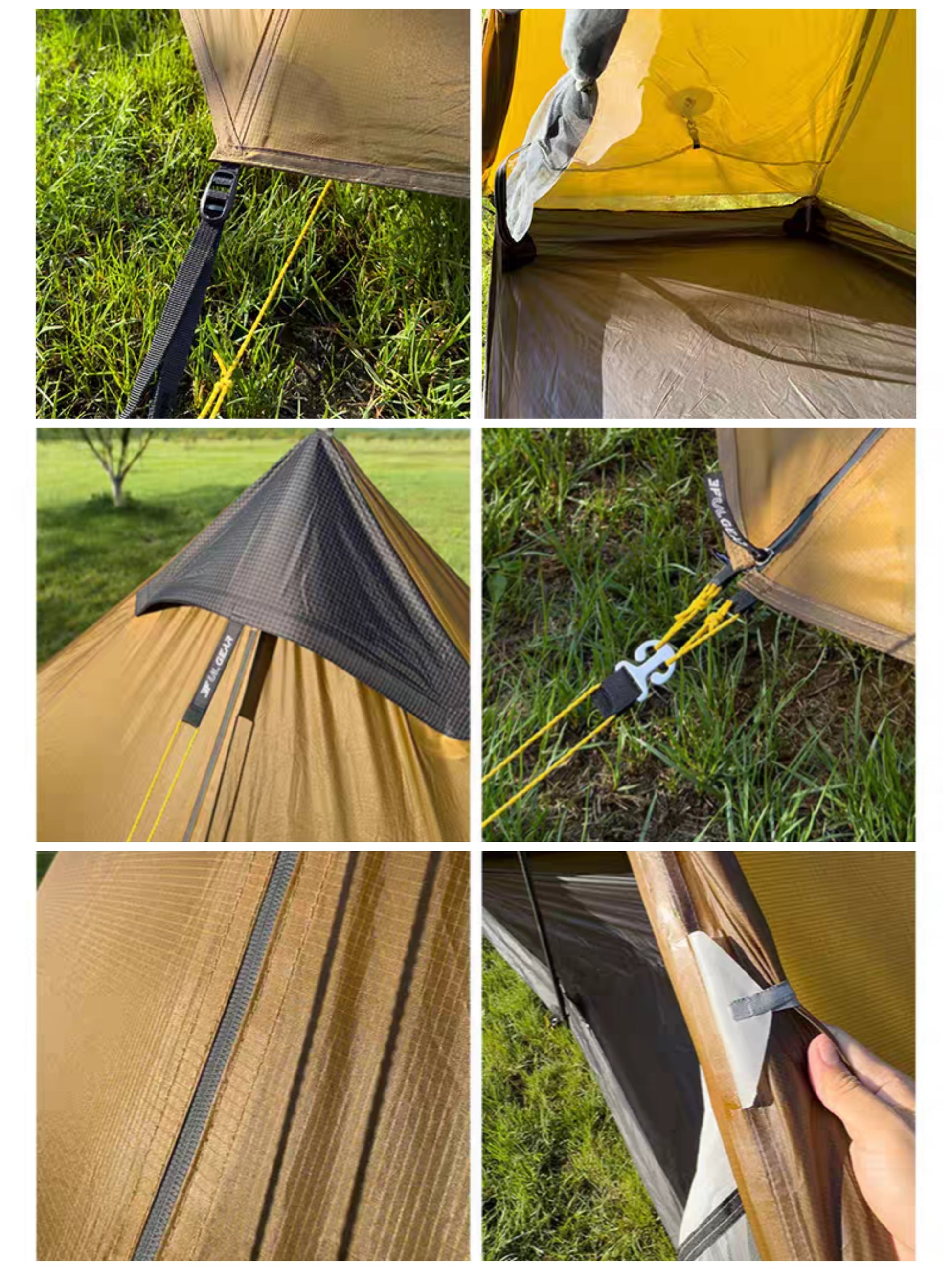 | Accessories | Outer Tent*1 + Inner Tent*1 + 2mm Reflective Wind Rope *4 + Ground Nail*9 + Hot Fit Patch *2 / Ground Nail Storage Bag |
